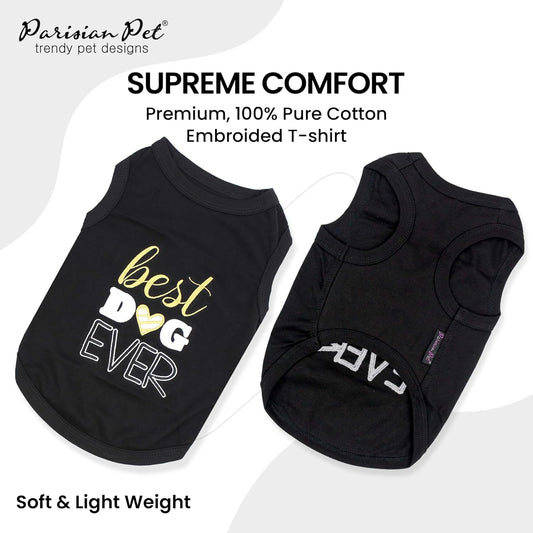 Dog Tshirt - Embroidered “ Best Dog Ever “ Shirt - Pure Cotton and Lightweight Pets Clothes - Sleeveless Black Doggy Tee Shirts - Machine Washable Shirts for Small Dogs - S